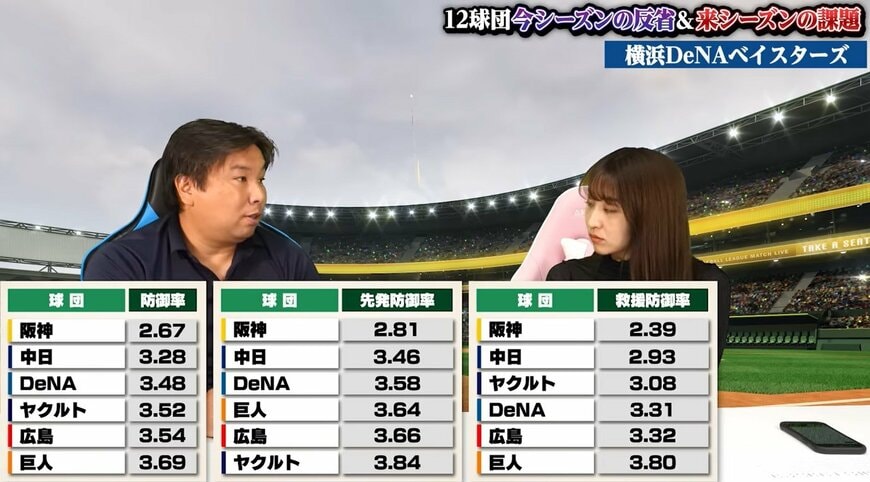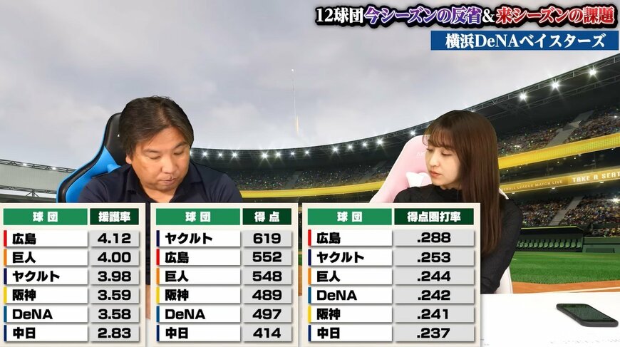 しかし、援護率(3.58)、チーム得点数(497)がリーグ5位の成績で、得点圏打率も4位の2割4分2厘となっていることから、「打っている割に点を入れていないのよ」「効率の良い攻撃をしていない」と里崎氏は説明します。