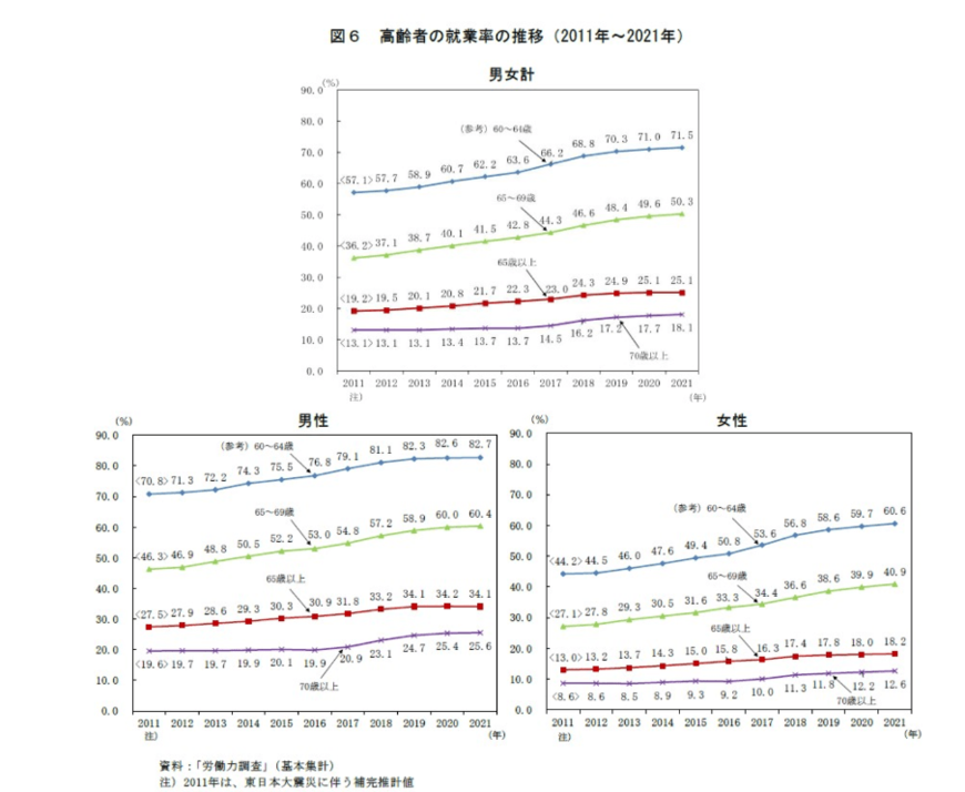 「人生100年時代」といわれている今、65歳以降の方の多くが仕事をしています。総務省統計局によると2021年時点で65~69歳の方の50.3%、70歳以上の方の18.1%が仕事をしています。