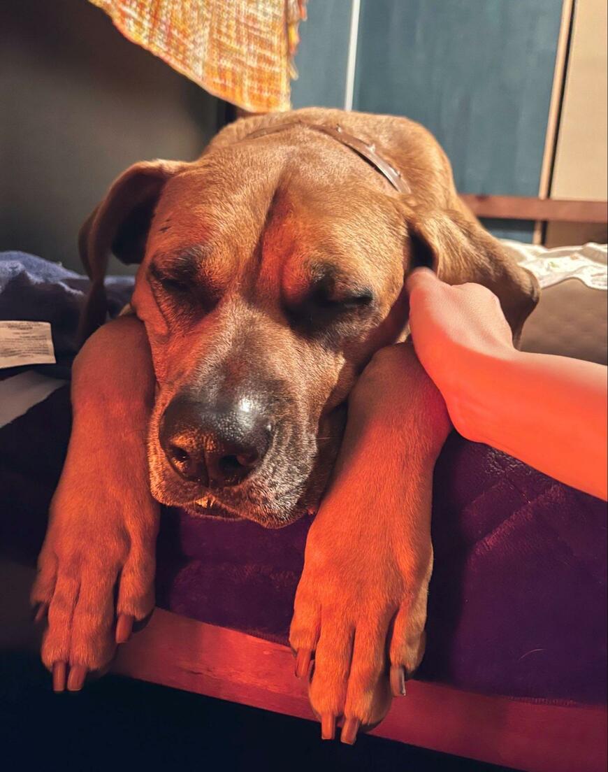 飼い主さんに手を添えられながら、とっても気持ちよさそうに眠る1匹のワンちゃんが写っています。おめめを閉じてスヤスヤと眠りにつく姿からは安心感が伝わってきて、心が温まるワンショットです。