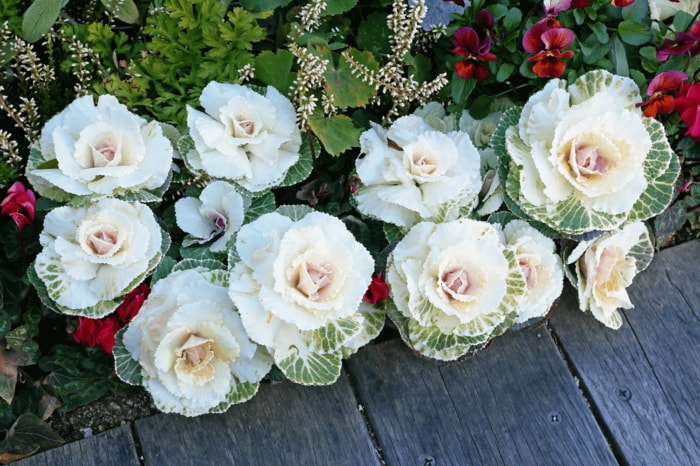 冬の花壇に欠かせないハボタンは、ハボタン以外の冬の花とも相性がバツグンです。特にパンジーやビオラ、ガーデンシクラメンとは互いを引き立て合い、華やかな雰囲気になります。