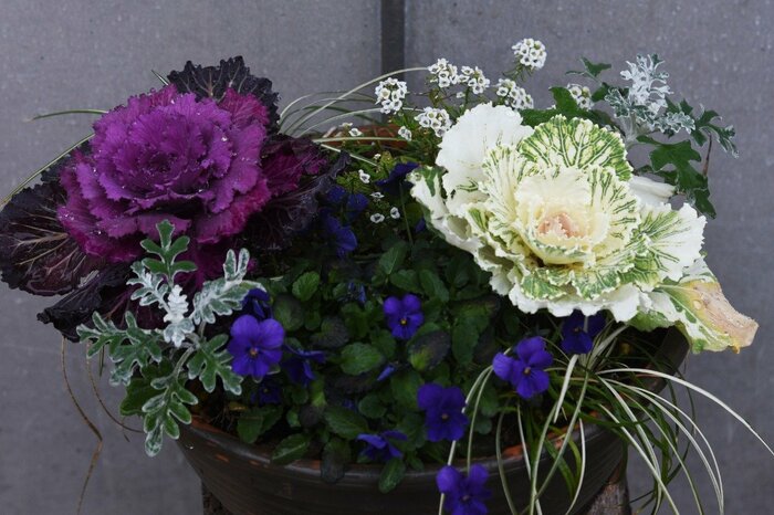 意外ですが、ハボタンは洋風の寄せ植えにもオススメ。特に新品種のハボタンは見た目も可愛らしく、オシャレなカラーの品種も続々登場しています。