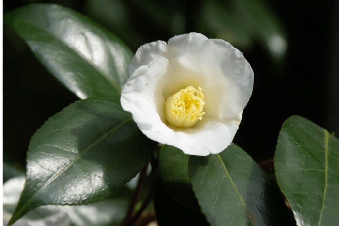 濃い緑の葉と透き通るようなホワイトカラーの花が美しいツバキ。華やかながらも、しっとりとした気品のある美しさで冬を彩ります。