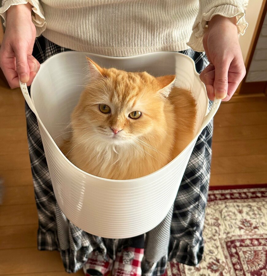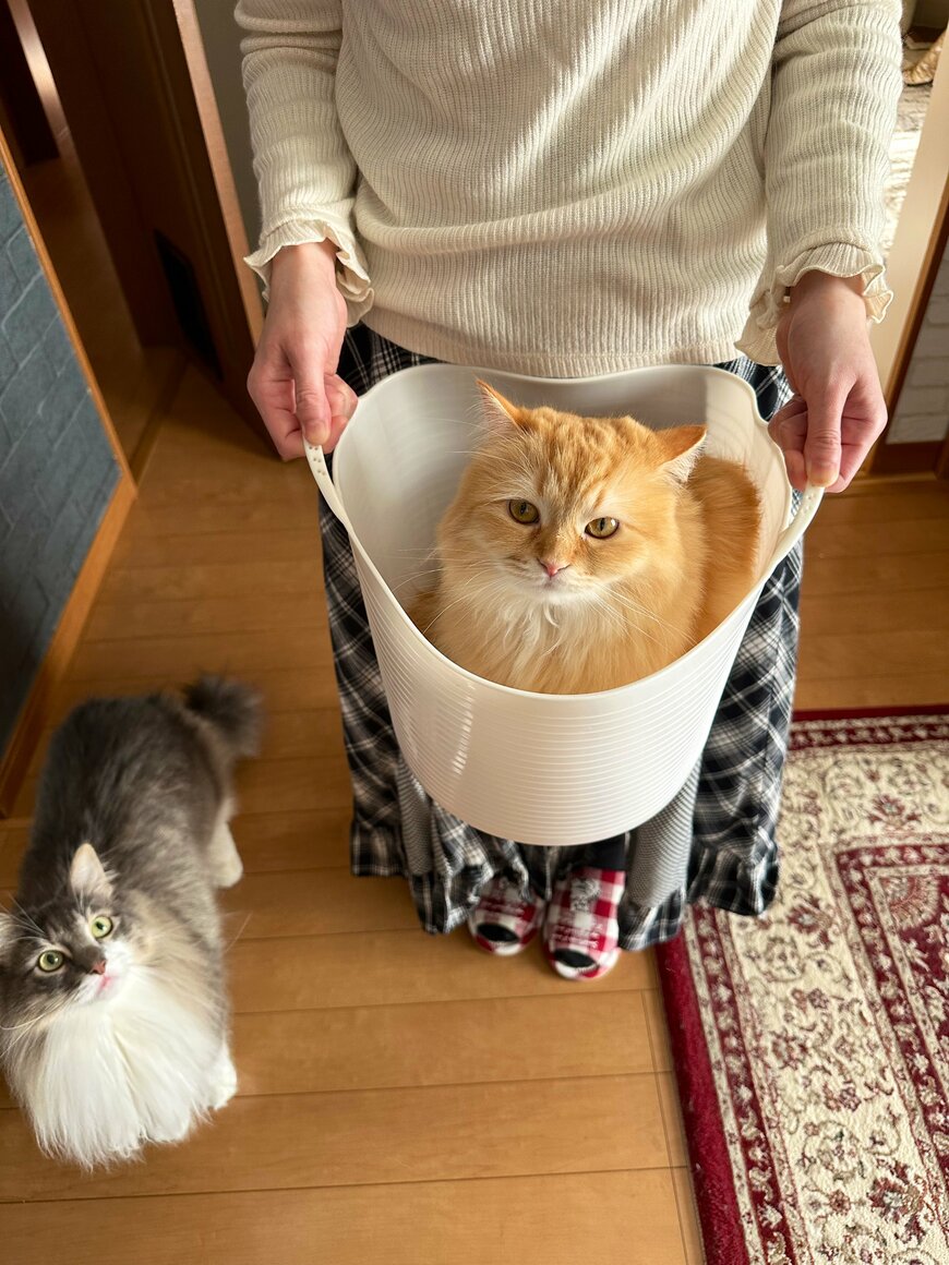 洗濯カゴにすっぽりとおさまりながら奥様に運ばれる姿に、思わず笑みがこぼれてしまいます。