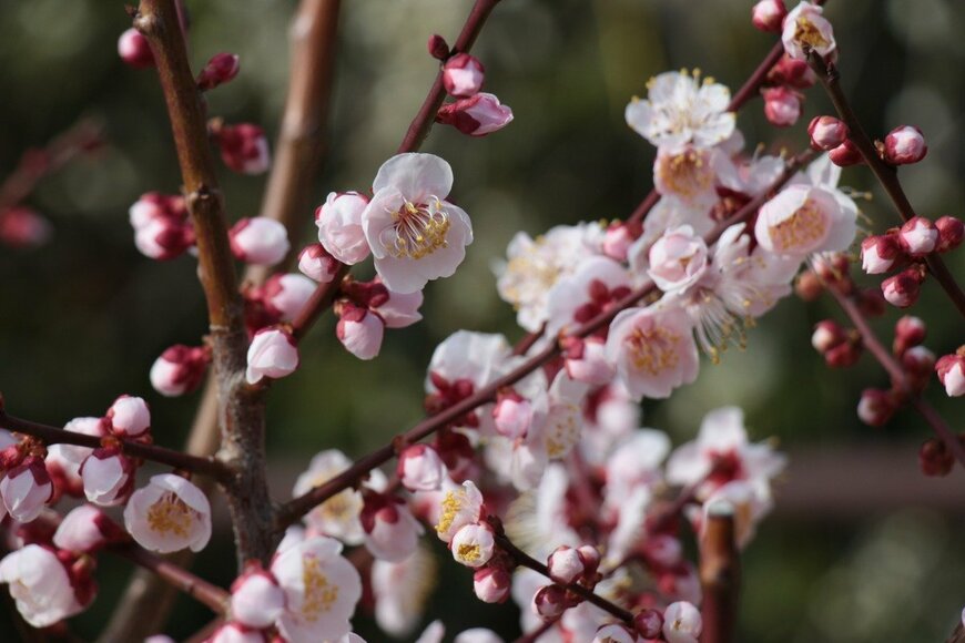 ピンクやレッド、ホワイトの花は組み合わせると紅白のおめでたい飾りに。ほのかな香りが楽しめるのも嬉しいですね。枝に花がつく姿が美しく、シンプルな花びんにウメだけを飾ってみても気品が漂います。