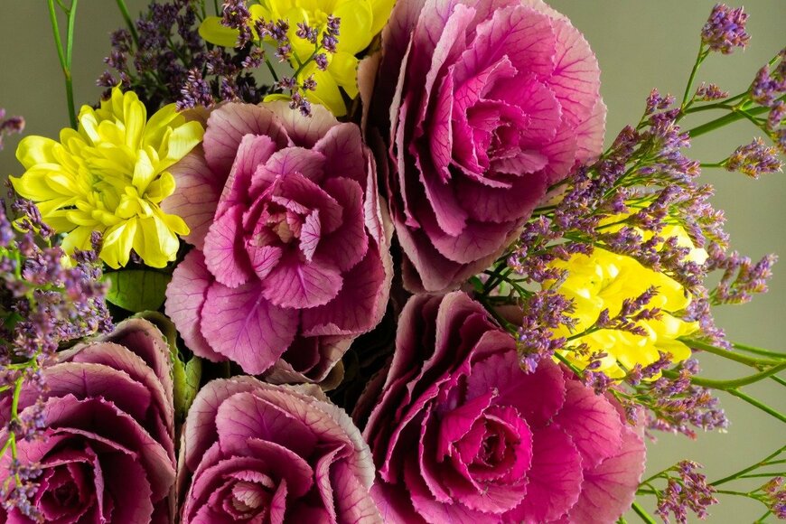 茎が長いハボタンは他の花とも生けやすく、手軽にお正月の雰囲気を出しやすいでしょう。ポンポン咲きのキクなどと数本で生けると可愛らしい雰囲気に。マツやナンテンなどと生けると、お正月のムードが高まります。