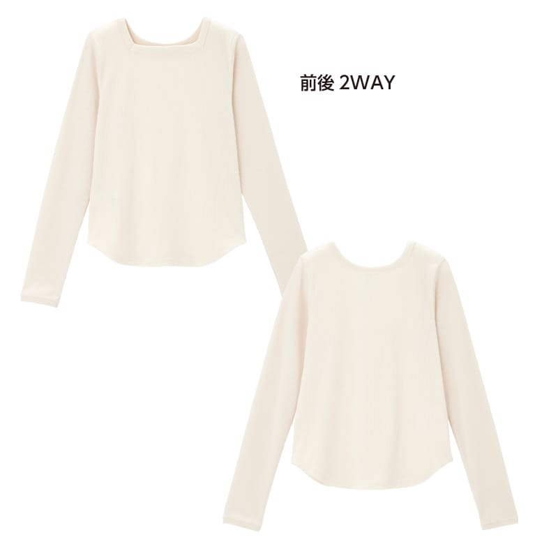 襟ぐりのデザインが四角と丸になっているカットソーです。シンプルなデザインなので、カジュアルにもキレイめにも着こなすことができそうです。