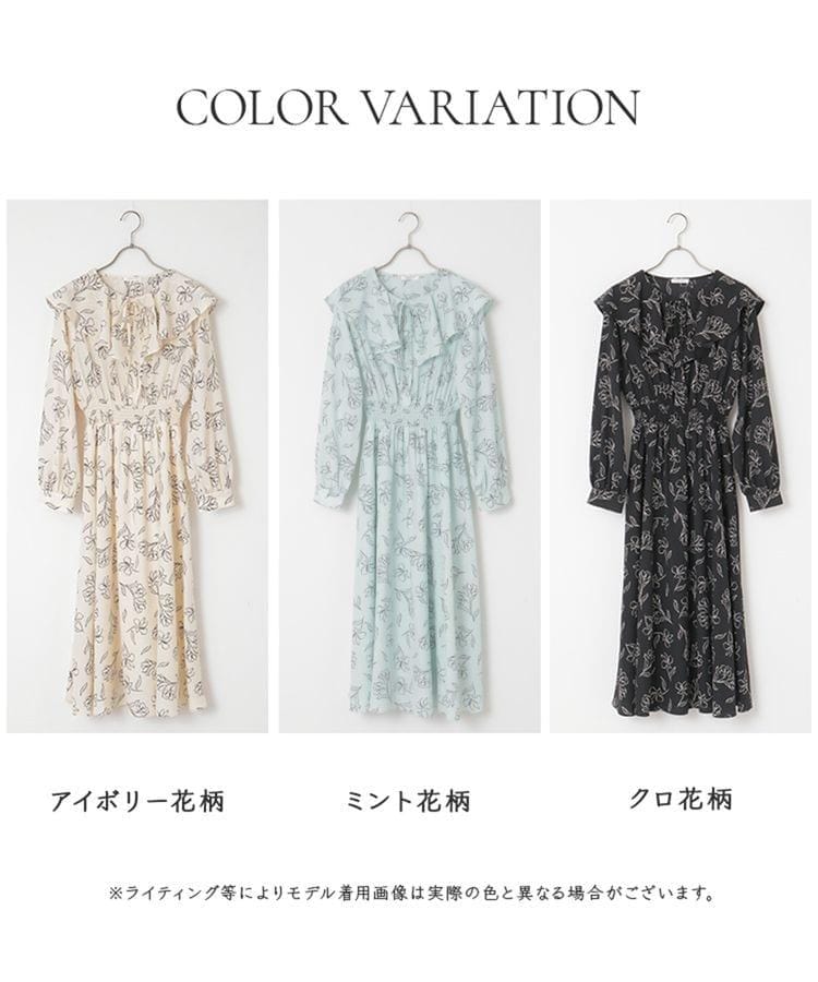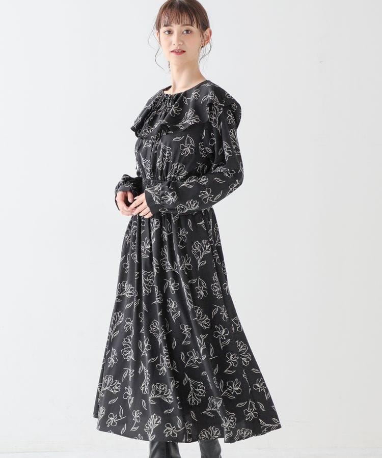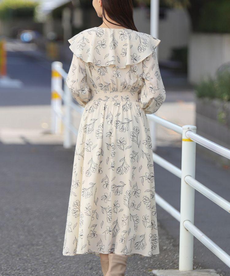 ケープ風のフリル襟が素敵なワンピースです。手書き風の花柄が高級感と華やかさを演出してくれます。