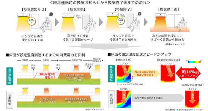 Xシリーズでは、CO2センサーで換気の開始と終了が判定できるため、換気中は運転をセーブして消費電力を抑え、換気終了後は、暖房時には冷えた床面をセンサーで検知して、すばやく足元から暖めます。