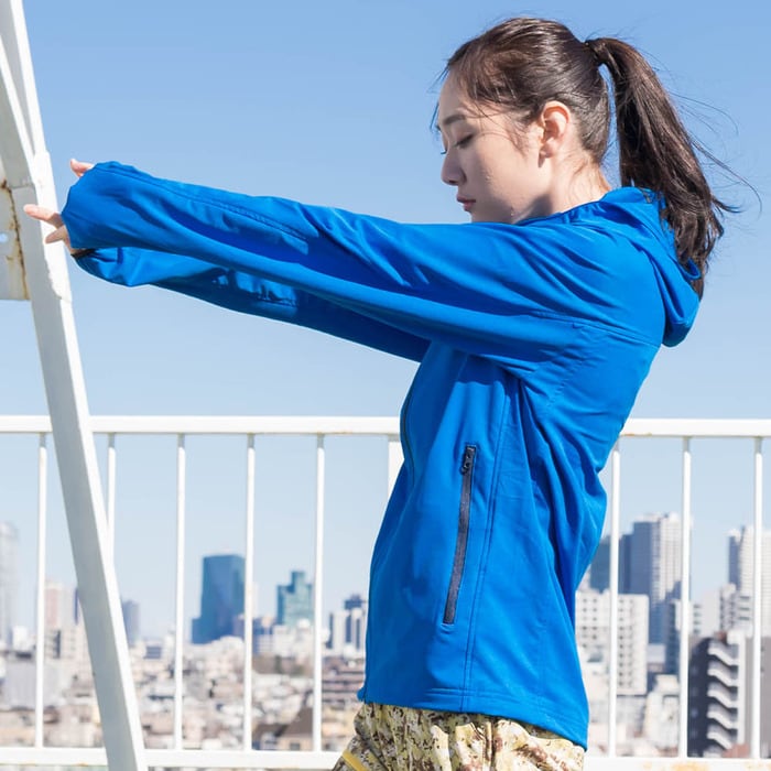 細身シルエットのフード付きアウターです。撥水加工を施したソフトなストレッチ生地を採用。裏地は凹凸があり、汗ばなれしやすいです。さらに、ポケットのベンチレーションがムレを防ぐため、快適な着心地を叶えます。ポケッタブル仕様でコンパクトにまとめられるため、持ち運びに便利です。