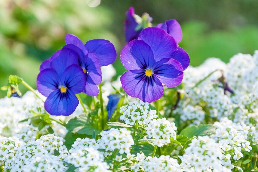 スイートアリッサム、バコパは草丈が低い植物。パンジー・ビオラの足元を飾る花として重宝します。鉢から垂れるように植えてみてもよいでしょう。