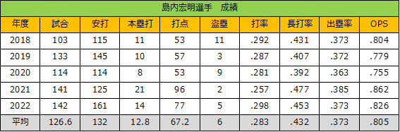 5年間の平均成績を見ても、打率2割8分3厘、12.8本塁打、67.2打点と高い水準で安定しており、チームとして必要不可欠な選手といえることでしょう。