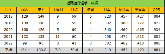 5年間の平均では、打率3割1分3厘、7本塁打、59.6打点、OPS.881と高水準の成績を残しています。驚きなのは出塁率の平均が4割を超えていることです。近藤選手の選球眼の良さが分かりますね。