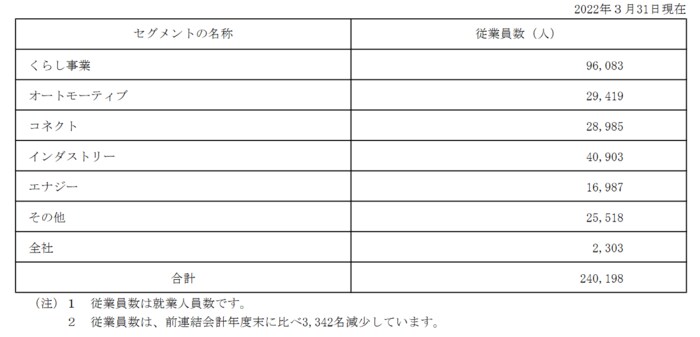 パナソニック ホールディングス株式会社(提出会社)の2022年3月末時点での従業員数、平均年齢、平均勤続年数および平均年間給与は以下の通りです。