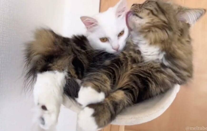 そんなふたりは、こんなにギュウギュウの場所でも気にする素振りを見せません。そしてメルくんは、マオくんを丹念に毛づくろいしていますね。お互いの愛情と仲のよさがたっぷりと伝わってくる光景は、眺めているだけで自然と心が温まります。
