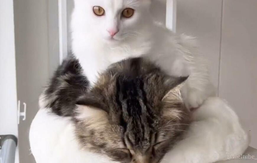 動画の終盤では、クッションのような場所で一緒にくつろぐふたり。目を閉じてスヤスヤ眠るメルくんにまたがりながら、カメラ目線を送るマオくんが写っています。