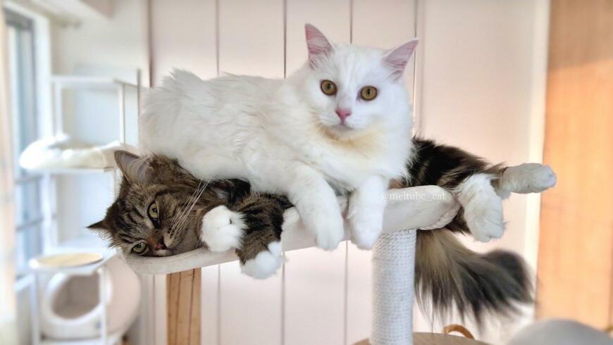 兄貴分のメルくんの大きさを越えた今でも「ピッタリくっついて寝たい」という気持ちは変わらないようです。4枚目の写真には、成長したマオくんがメルくんの上で堂々とくつろぐ姿が写っていました。