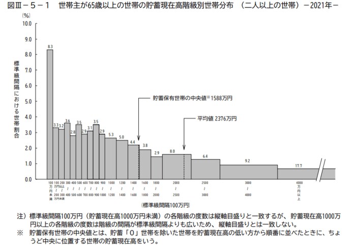 こちらの調査によると、65歳以上世帯の貯蓄平均は2376万円です。