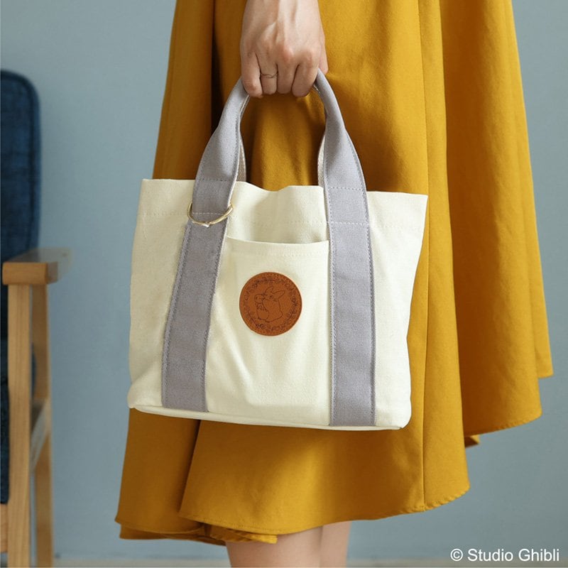 バッグの中央に仕切りがついているので、中身を整理しやすいトートバッグ。ポケットも豊富で、中に3つ、外に1つと使いやすさは抜群です。レザー調のワンポイントにトトロがさりげなくあしらわれているのもおしゃれ。