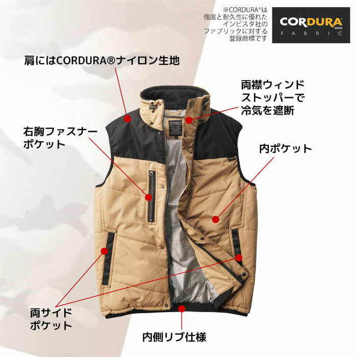 2022年モデルは、デザインをカジュアルに変更。ワークはもちろんタウンでも着こなせるベストになりました。耐久性に優れたCORDURA®を配し、ワークマンならではの裏地は保温性の高いアルミプリント使用しています。