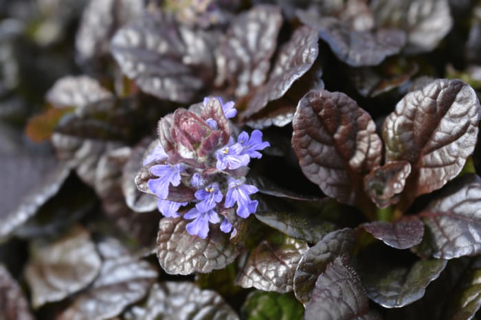 カラーリーフとしても楽しめるアジュガは人気のグランドカバープランツ。春に咲く可憐な花も見どころのひとつです。