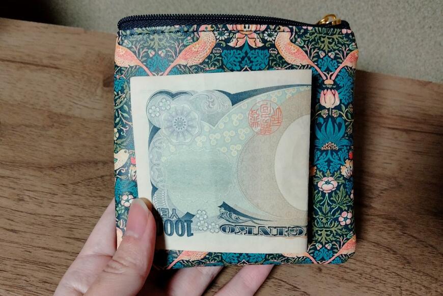 セリアのスクエアポーチはミニ財布にもなるようなサイズ感です。1000円札と比較すると下の写真のようになります。