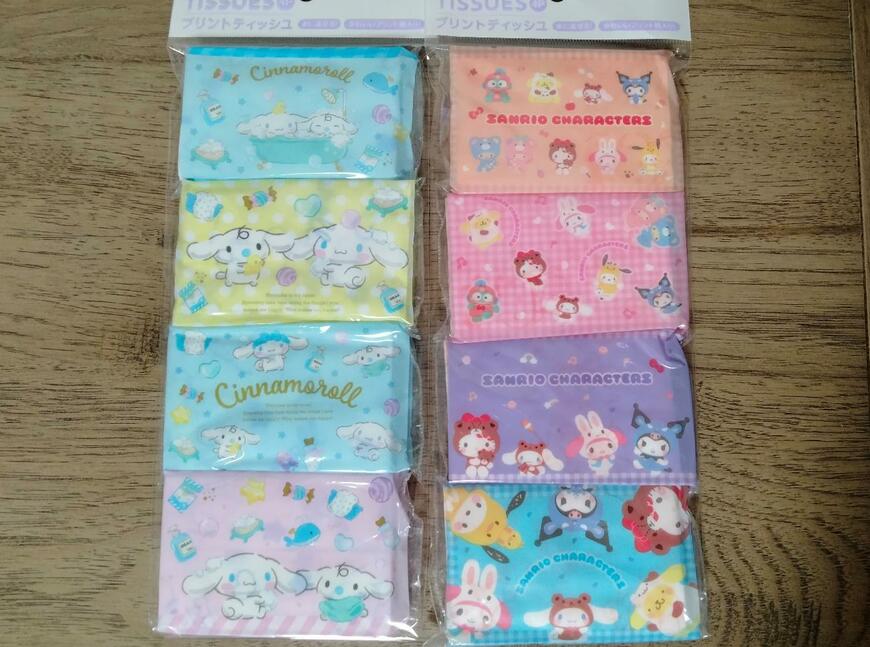 こちらがサンリオのポケットティッシュです。写真のように、1つのパッケージに4つ入っています。