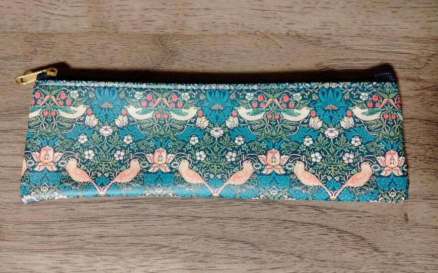 クラシカルなブルーが素敵ないちご泥棒デザインのペンケースです。上下に6羽のツグミが描かれているのがかわいいです。