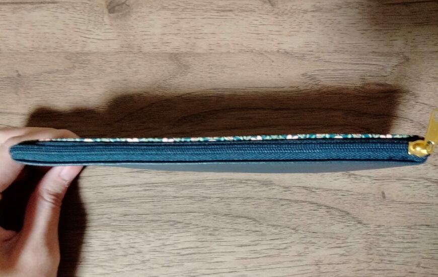 ファスナーもブルーで、ファスナーの持ち手部分がゴールドとなっています。ユニセックスなデザインですので、男性にも使いやすそうなアイテムです。