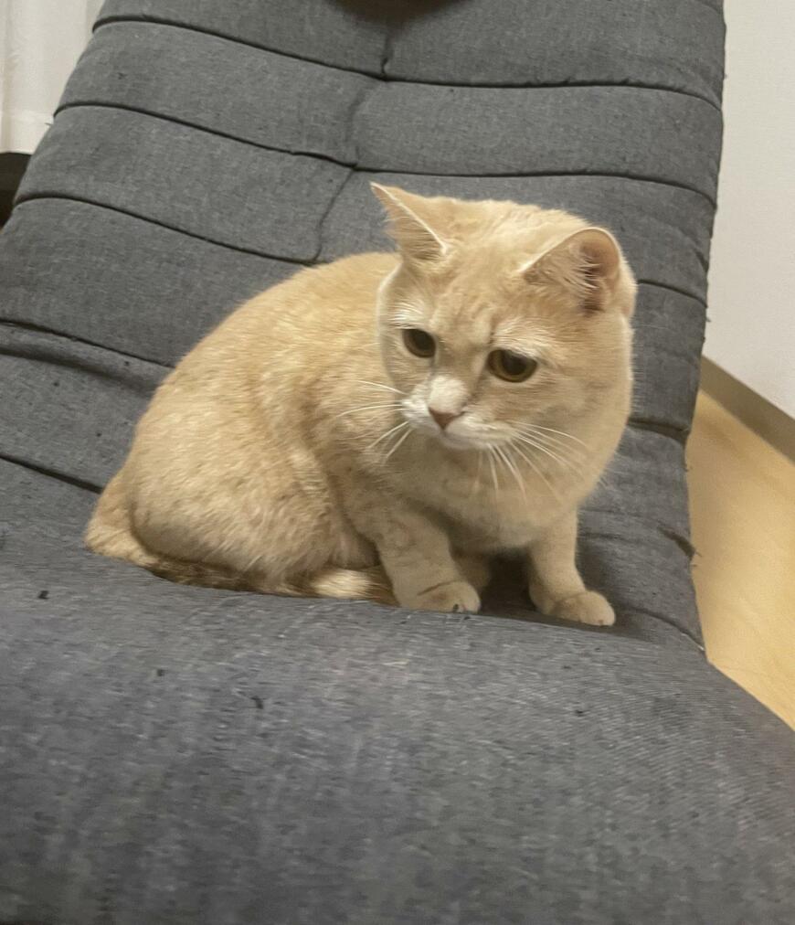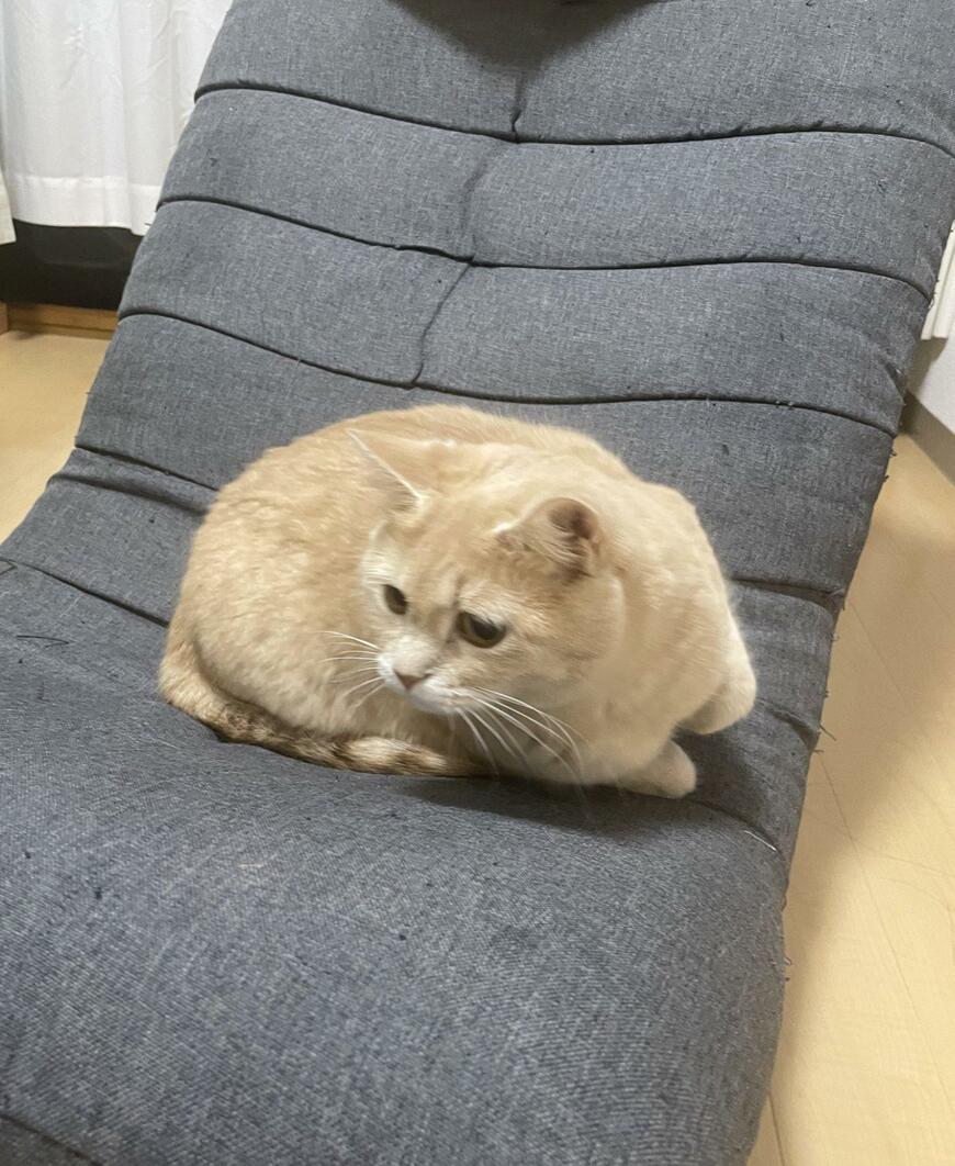 投稿された写真を見てみると、1枚目に写るくるみちゃんは、座椅子の上でポジショニングしているようです。足と尻尾はすでにお腹の下にしまっていますね。そして「ここに座ろうかな」といった具合で姿勢を低くしています。