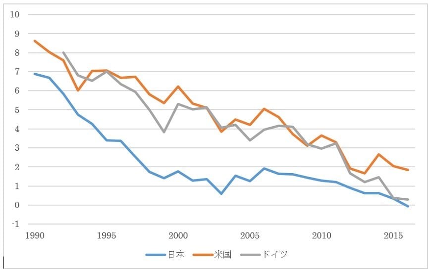 まず、先進諸国の長期金利の推移について見てみると、低金利化が進んでいることが一目瞭然です(図表1)。日本では、2016年のマイナス金利導入により長期金利も一時マイナス圏に突入しました。米国ではここ1、2年利上げが行われており、直近で見たときの利子率は上昇していますが、長期的に見ると減少していることが分かります。