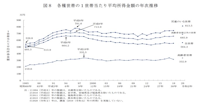 子どものいる世帯では1996年に781万6000円だったものの、その後緩やかに減少し、2009年以降また少しずつ上昇しています。