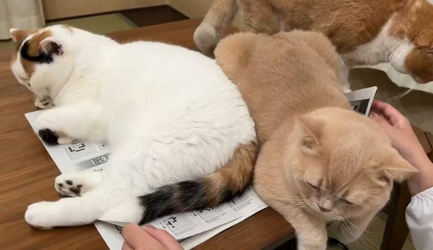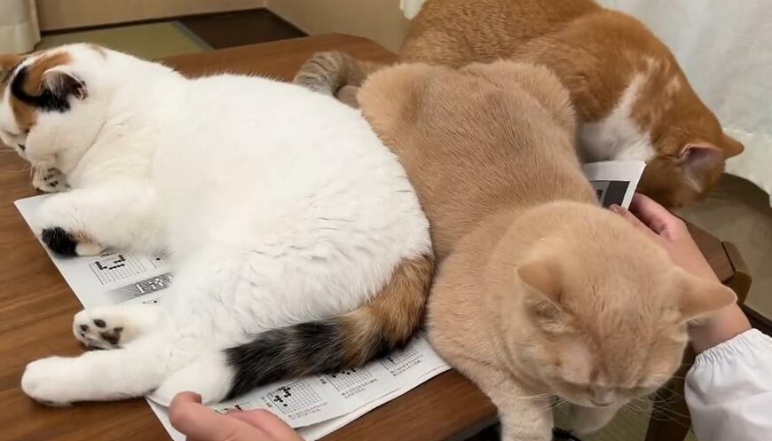 動画からは猫ちゃんの「ゴロゴロ……」という音が聞こえてきます。吸い寄せられたかのように集まって、隙間なく密集する猫ちゃんたち。「新聞じゃなくてわたしたちを見て!」なんて気持ちが伝わってきますね。