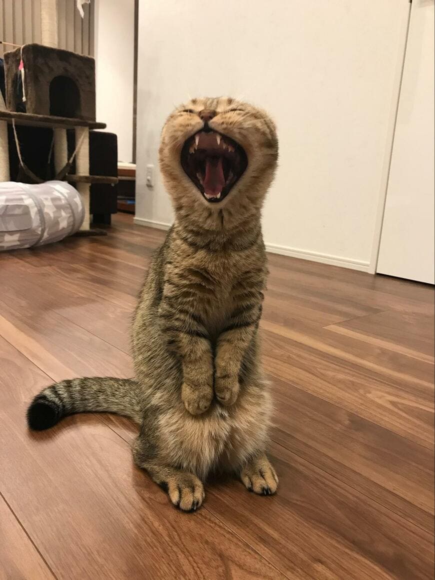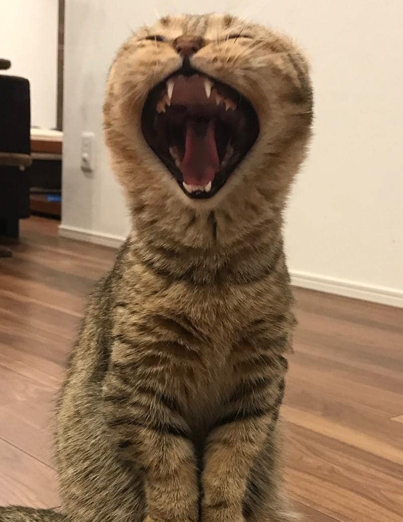 頭を後ろに傾けているからか、耳が隠れてお顔がまん丸フォルムになっているところも愛らしいです!想像を上回るほどの豪快なあくび姿に、思わず爆笑してしまいます。