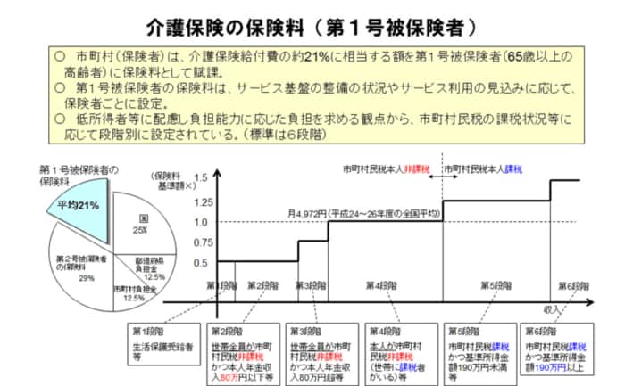 住民税の課税状況によって、段階的に保険料が設定されています。標準は6段階となっており、住民税非課税世帯は1段階~3段階と低く設定されています。
