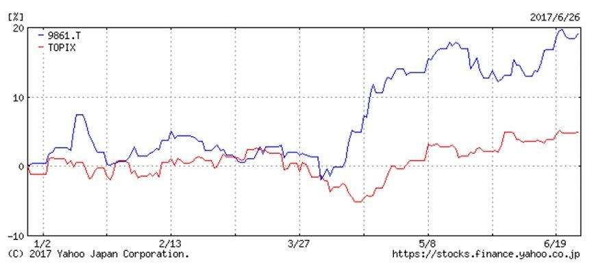 2016年末以降の株価騰落率を見ると、TOPIXが+6%上昇であるのに対して、吉野家HDが+19%上昇、松屋FDが+14%上昇、ゼンショーHDが+9%上昇となっており、いずれもTOIXを上回るパフォーマンスを示しています(2016年12月30日と2017年6月26日の終値の比較)。しかも、途中で若干の凸凹はあったものの、3社ともほぼ一貫してTOPIXを上回る株価パフォーマンスを維持してきました。