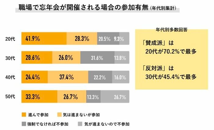 実際にJob総研の同調査では、今年の忘年会の参加有無について、各年代の半数以上が「気が進まないが参加」または「不参加」と答えており、忘年会に対して消極的なのが分かります。