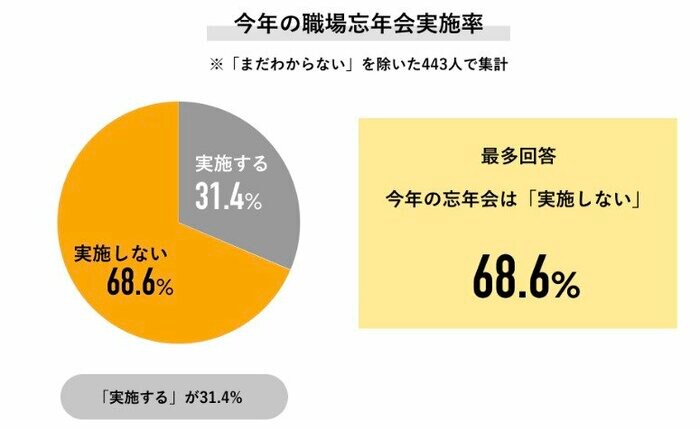 実際に、Job総研が調査した「2022年 忘年会意識調査」によると、今年の職場忘年会の実施率は、実施しないが68.6%となりました。