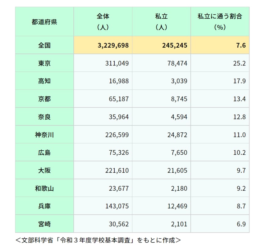 文部科学省の「令和3年度学校基本調査」によると、私立中学に通う割合は全国で7.6%に対して、東京都は25.2%となっており、およそ4人に1人は私立中学に進学しています。