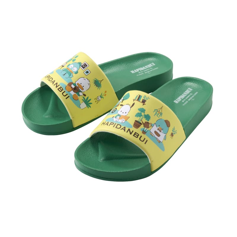 はぴだんぶいのキャラクターたちがかわいいサンダルです。グリーンとイエローのコントラストが、平成レトロな雰囲気も出しています。