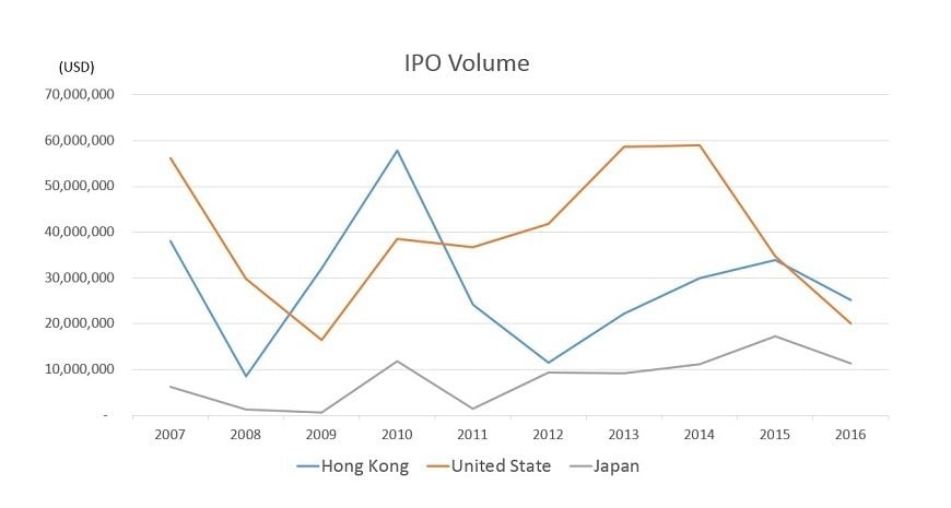 新規公開株の金額で見ると、近年ニューヨーク証券取引所と競っているのは香港証券取引所となります(図1参照)。2009年、2010年にはニューヨーク証券取引所を上回る勢いもありましたが、ここ数年は水をあけられています。HKEXは、今回の「第3市場」創設により、この差を埋め、再び世界のトップの座を奪回できるか注目されます。