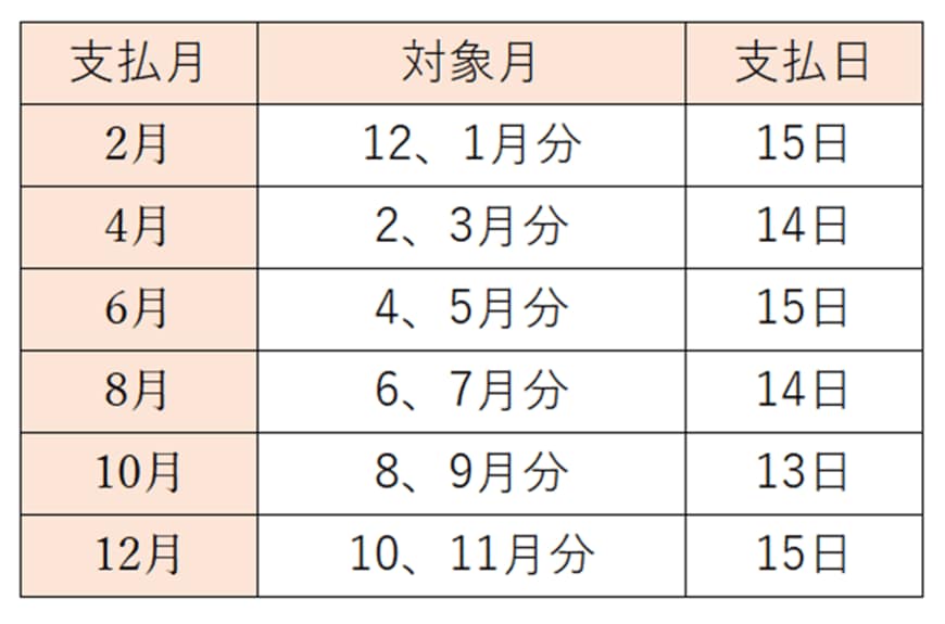 前月までの2ヶ月分が、15日に支払われるイメージです。もし15日が土日祝日の場合、前日の平日に支払われます。