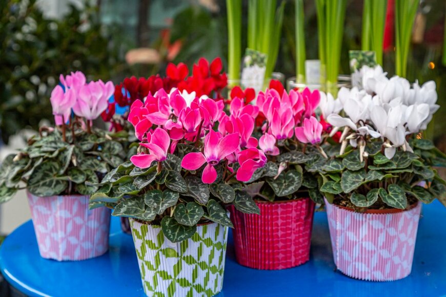 シクラメンはつねに高い人気を誇る冬の鉢花。花色のバリエーションが豊富で、ゆらめく炎のように見える花と、ハート型のカワイイ葉が魅力的です。