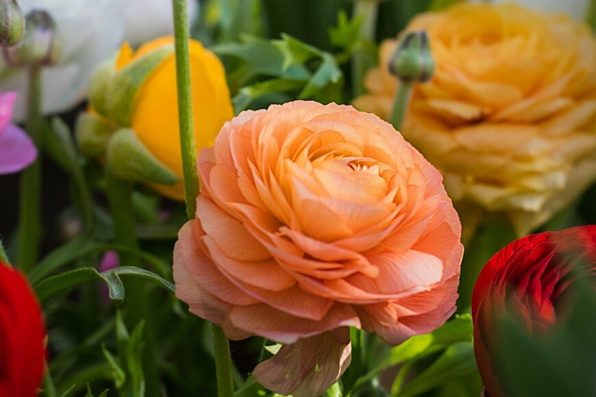 幾重にも重なった花弁が特徴のラナンキュラスは多年草の球根植物。植え付けの適期は今月までなので、早めに手に入れて植え付けをおこないましょう。