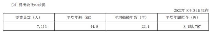 東京電力ホールディングス(提出会社)の2022年3月末時点での従業員数、平均年齢、平均勤続年数および平均年間給与は以下の通りです。