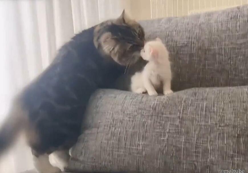 しばらくすると先住猫のメルくんがやってきます。颯爽とマオくんのもとへ行き、顔を近づけスキンシップをとっているようです。