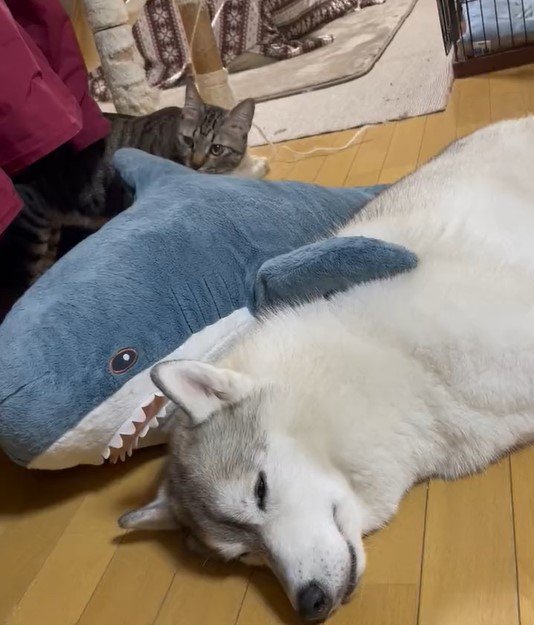 ママ犬と添い寝するサメのぬいぐるみに嫉妬した、保護猫ちゃんの奮闘姿がTwitterに投稿され多くの注目を集めています。