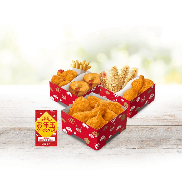 ・セット内容:オリジナルチキン4ピース、えびぷりぷりフライ2ピース、ビスケット2個、ナゲット5個、ポテト(S)、お年玉クーポンパス