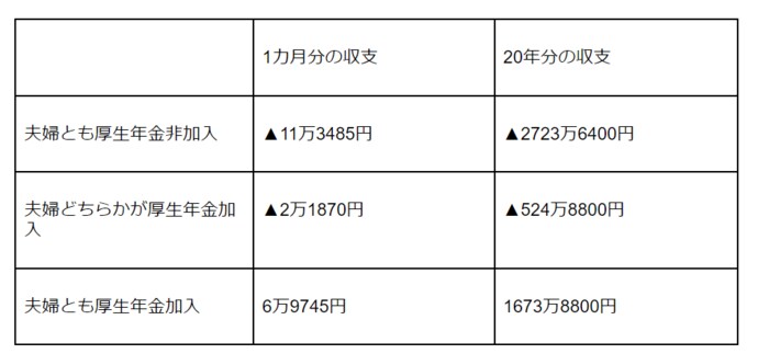 しかし、「夫婦とも厚生年金未加入世帯」と「夫婦どちらかが厚生年金加入世帯」では、以下のように収支が赤字になります。