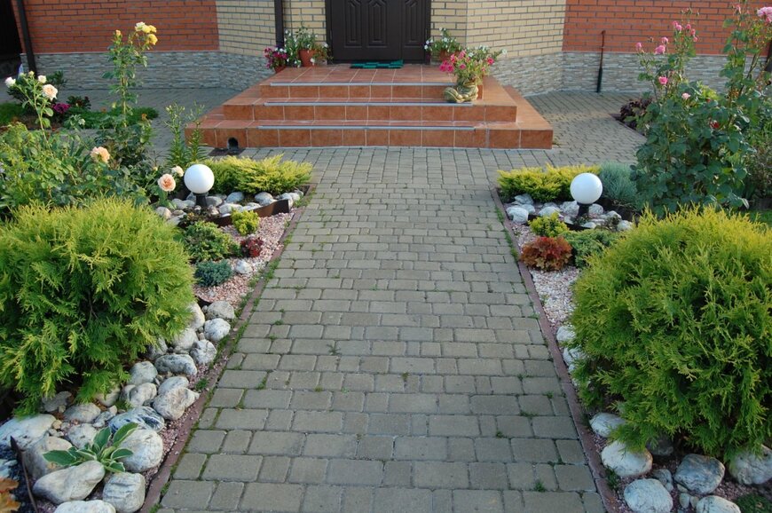 アプローチに沿ってカラフルな花を植えると、訪れる人が花を見ながら気持ちよく歩けます。ズラリと並べた植栽は華やかな雰囲気に。ところどころにアクセント的に植えるのもオシャレです。
