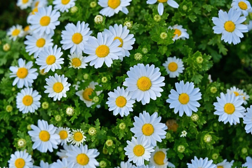 真っ白な花が愛らしいノースポール。花芯の黄色と花弁の白のコントラストが冬の花壇によく映えます。草丈は20~30センチ。こんもりとまとまるので、狭いスペースにも向いています。